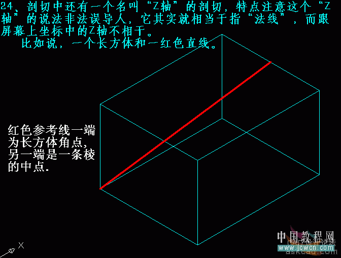 2 4、剖切中还有一个名叫“Z轴”的剖切,特别注意这个“Z轴”的说法非法误导人,它其实就相当于指“法线”,而跟屏幕上坐标中的Z轴不相干。比如说,一个长方体和一红色直线。红色参考线一端为长方体角点,另一端是一条棱的中心。