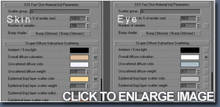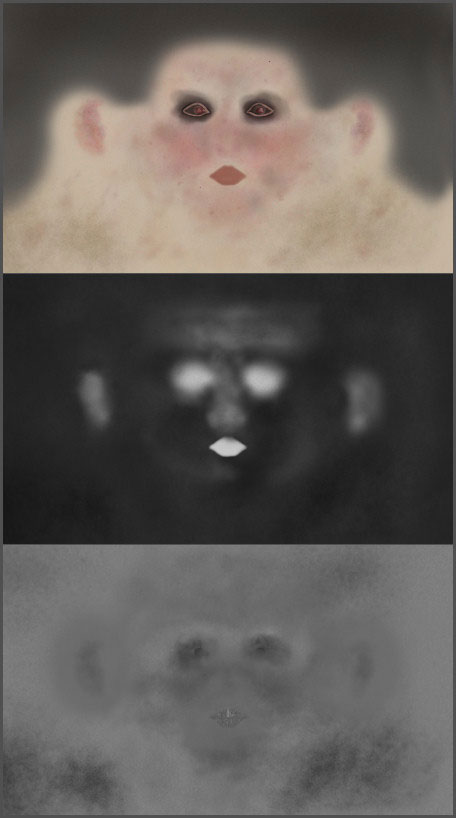 现在。可以处理其他材质了。我使用了同样的材质,仅仅让它变成黑白色,然后单独调整。凹凸贴图方面,我绘制了嘴唇上的褶皱,在眼部周围添加了噪点(为了改善)。高光和反射贴图方面,我改变参数的值,让眼部周围、耳朵、嘴唇、鼻子和前额更有光泽。这是完成模型的线稿和渲染图。