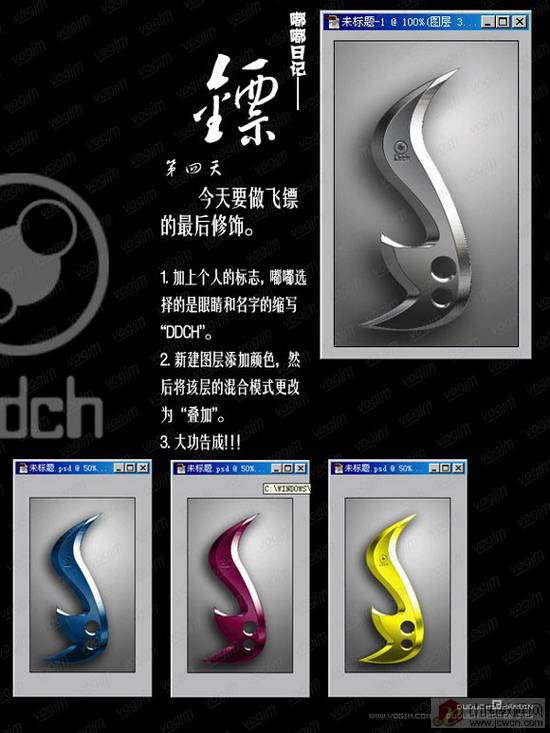 | 飞镖最后的修饰 1、加上个人的标志。 2、新建图层添加颜色,然后将该图层的混合模式改为叠加。 3、大功告成。 |