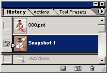 | 填充历史记录到底填充什么东东? 看到下图那个历史笔刷吗?右边的小图叫做快照,快照是什么呢,其实就是历史记录的标记,你可以在任何步骤的时候,按一下历史面板下面的拍快照图标(像照相机那个),拍下当前的快照,当你往下操作后,后悔了,想回到刚才拍快照的那个步骤,那么,只需要在历史面板中点击一下该快照,就可以undo到该时候的操作记录。 保存过的图像,会有一张默认的快照,即是刚打开该图片的状况。 |