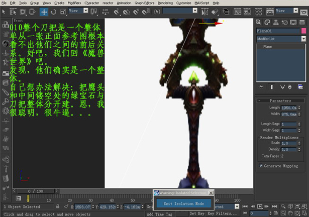 整个刀把是一个整体,单从一张正面参考图根本看不出它们之间的前后关系。好吧,我们回《魔兽世界》吧。发现,它们确实是一个整体。自己想办法解决:把鹰头和中间镂空处的绿宝石与刀把整体分开建。恩,我很聪明,很牛逼...(图10)