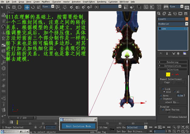 在理解的基础上,按需要绘制一个二维封闭线,注意之间的转折关系,根据模型的关系建立。对边缘调整完成后,加个挤压值,具体方法和前面三个部分制作是一样的。接下来也是转可编辑多边形,对其进行加点线细化面,去表现它的前后转折关系。这里也是靠自己理解去建模。(图11)