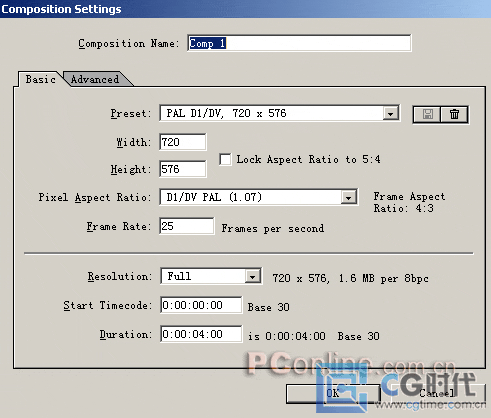 步骤1 启动After Effects 6.5。按“Ctrl+Alt+N”组合键建立一个Project(项目),然后打开“Composition/New Composition”菜单选项,建立一个类型为PAL D1/DV,大小为720×576的Composition,帧速率为25FPS,时间长度为4秒