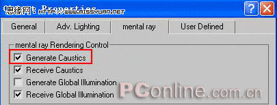 11、单击工具栏上的Render Scene Dialog工具打开渲染设置对话框,进入Indirect lllumination栏中,勾选Caustics(焦散)选项下的Enable,这样我们就打开了产生焦散的选项。如图1-13所示。