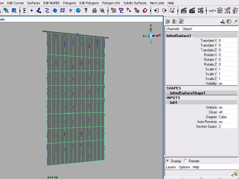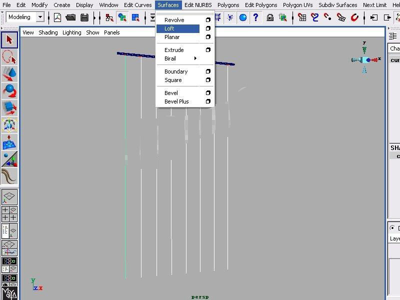 5 选择所有曲线,在modeling模块中,使用surfaces\loft命令把选择的曲线放样成一个曲面物体,如下图所示。