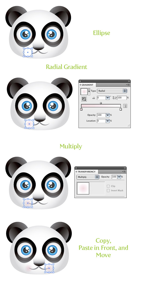在靠近嘴巴边缘的地方绘制一个圆。使用径向渐变为其填充,第一个颜色滑块设为粉红,第二个设为白色。接下来,在透明度面板里把混合模式设为正片叠底。复制并粘贴在前面,把副本移动到嘴巴的另一边。