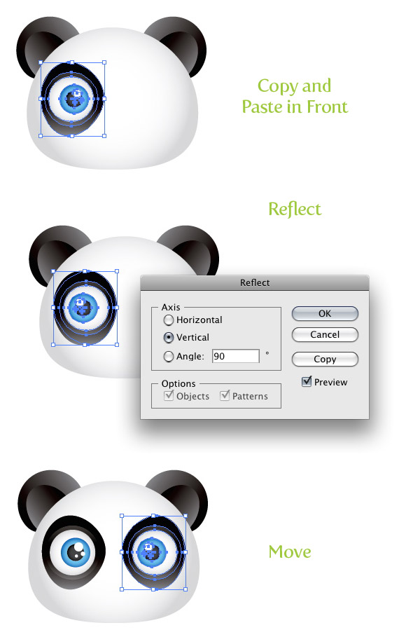 复制所有眼部的形状并粘贴在前面。接着,使用 对象-变换-对称,然后选择垂直按钮并按确定。最后把副本移动到右边、