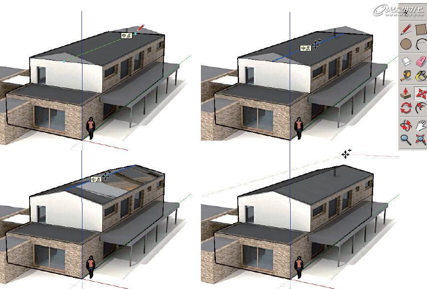 在使用[线]工具绘制顶面中线时,软件会自动拾取线段的中点,以蓝色的点显示。经过以上几步简单的操作就将主体建筑的外形创建出来了,通过操作,相信读者已经体会到了SketchUp易用、便捷的特点。接着我们来创建其他的建筑模型。