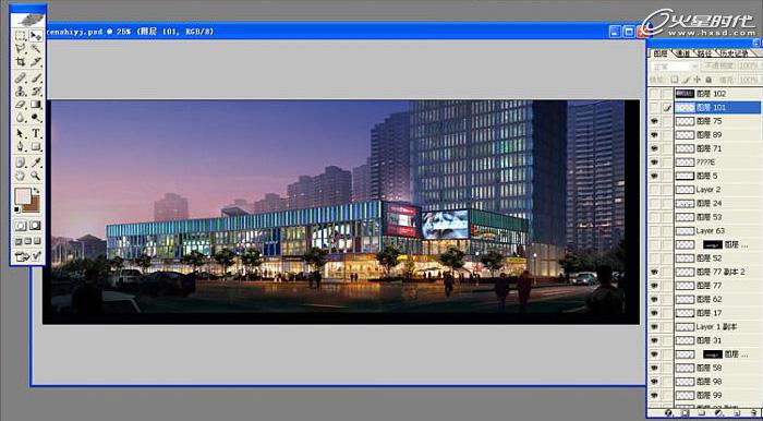 PhotoShop建筑教程:商业夜景效果图后期制作流程(4)